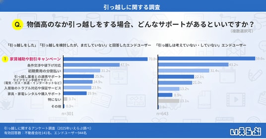 これらの結果から、物価高の影響により引っ越しに対する費用負担への意識が一層高まっている一方で、家賃補助や割引キャンペーン、初期費用の分割払いといったサポートへのニーズも非常に高いことがわかります。