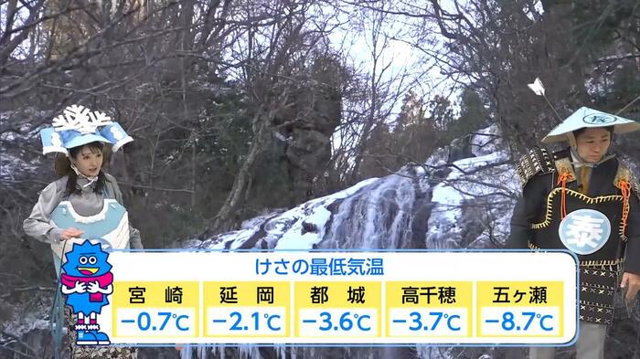 特に寒さが厳しかったのが五ヶ瀬町で、最低気温は氷点下8.7度を記録。五ヶ瀬町にある「白滝」が凍りついた様子の映像が、その寒さの威力を物語ります。普段は勢いよく流れ落ちる滝が、厳しい寒さによって巨大な氷柱へと姿を変えました。