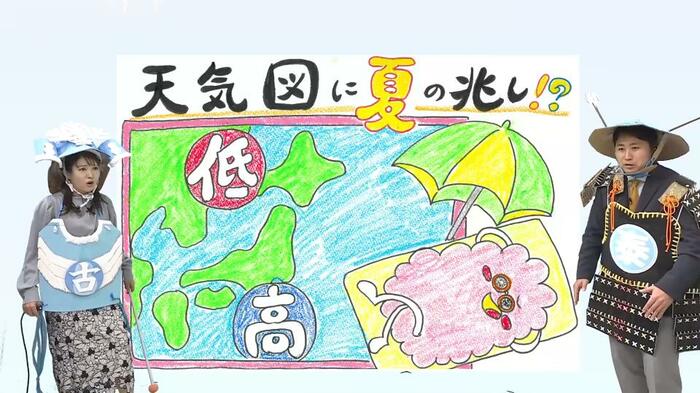 イラストを示して、「天気図に夏の兆しが見えてきました」と古山予報士。13日の予想天気図を見ると、これまで日本を覆っていた冬型の気圧配置が緩み、南から暖かい空気が入り込みやすい形に変わっています。