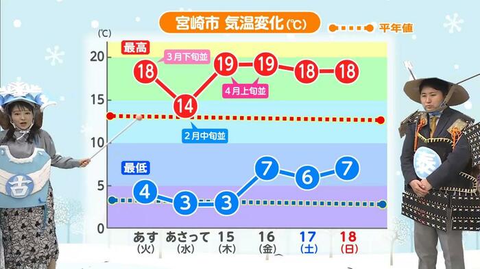 宮崎市の気温変化の予測を見ると、12日までは平年を下回る寒さでしたが、13日は一気に気温が上昇する見込みです。15日から18日には、最高気温が3月下旬から4月上旬並みの暖かさになると予測されています。