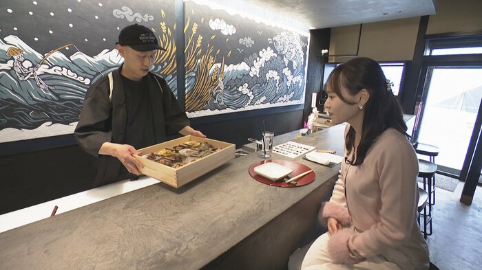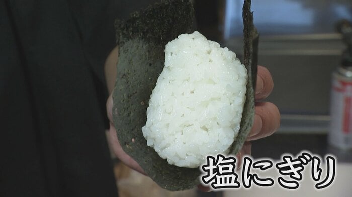 取材した吉國唯アナウンサーが最初に提供されたのは、意外にも「塩にぎり」だ。稲村店長は「富山のおいしいお米とおいしい海苔を味わっていただきたくて、塩にぎりから召し上がっていただいています」と説明する。