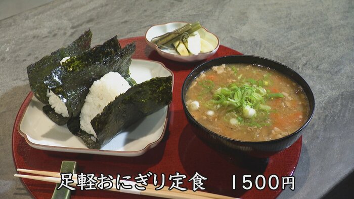 店の定番メニュー「足軽おにぎり定食」は、塩むすびと好きな具材のおにぎり2個に加え、山菜の昆布締めと満寿泉の酒粕入りの豚汁がセットになっている。さらに具材の内容をグレードアップした「大名おにぎり定食」も人気を博している。