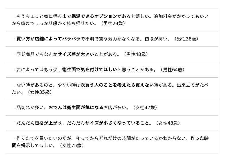 「出来立てのものを食べたい」「温かいもの、冷たいものが食べたい」は30代、「少量を買いたい」は女性70代で高い傾向です。