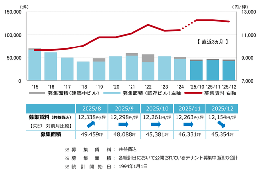 募集賃料は前月比マイナス109円/坪の12,154円/坪となった。前月から下落したものの、12,000円/坪台前半での動きが続いている。