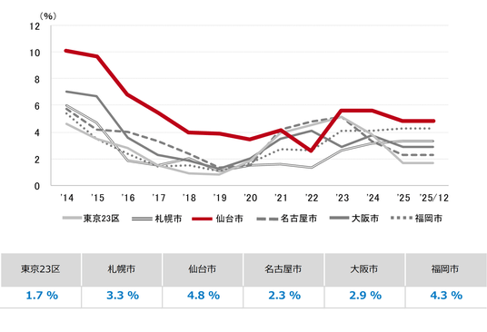 三幸エステート株式会社(本社:東京都中央区、取締役社長:福島正二郎)は、2025年12月度の仙台市オフィス賃貸状況(空室率&現空面積:全規模、募集賃料&募集面積:全規模、規模別空室率、主要エリア※1空室率:全規模)および全国6大都市(東京・札幌・仙台・名古屋・大阪・福岡)の大規模ビルのマーケットデータをまとめた「オフィスマーケット2026年1月号仙台」を公表します。