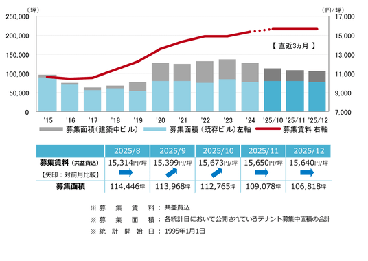 募集賃料は前月比マイナス10円の15,640円/坪となった。前月からわずかに下落したものの、既存ビルでは品薄感が漂っていることから、募集条件を従前よりも引き上げる動きが強まっている。