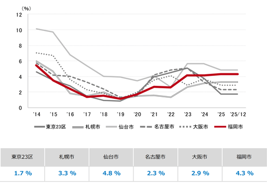 2026年の新規供給は約2.1万坪で、1万坪を超える大量供給は7年連続となる。今年は3棟の大規模ビルが竣工予定だが、賃貸条件と立地等のバランスが良好な物件を中心にテナント誘致が進んでいる。また、新築ビルに移転したテナントによる二次空室も足元では低水準に止まっている。そのため、新築ビルの竣工で空室率が一時的に上昇する可能性はあるものの、需給バランスが大きく緩む兆しは見られない。(福岡支店長 中村竜治)