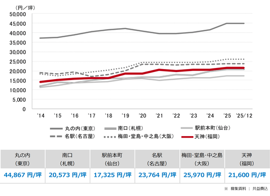 三幸エステート株式会社(本社:東京都中央区、取締役社長:福島正二郎)は、2025年12月度の福岡市オフィス賃貸状況(空室率&現空面積:全規模、募集賃料&募集面積:全規模、規模別空室率、主要エリア※1空室率:全規模)および全国6大都市(東京・札幌・仙台・名古屋・大阪・福岡)の大規模ビルのマーケットデータをまとめた「オフィスマーケット2026年1月号福岡」を公表します。