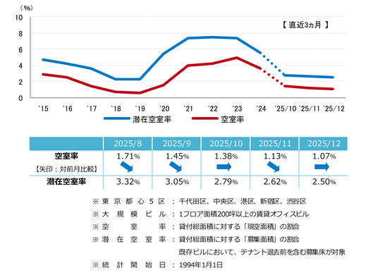 ネット・アブソープション(吸収需要)はオフィス需要の指標であり、一定期間におけるテナント入居面積(稼働面積)の増減を表す。2025年は吸収需要が新規供給を上回り、2年連続の大幅な需要超過となった。旺盛な需要により、空室率は直近1年間では3.62%から1.07%へと2.5ポイント超の大幅な低下となっている。