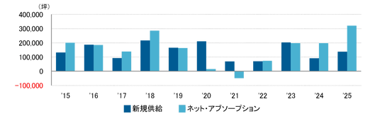 2025年の吸収需要は約32万坪と2004年以来で30万坪を超え、2000年以降の最大値を記録した。オフィス需要が非常に強く、既存ビルの募集床は品薄となっている。2026年の新規供給は約16万坪の見込みだが、多くの建築中ビルが既に高い内定率となっており、吸収需要のより一層の伸びは見込みにくい状況にある。(市場調査室 今関豊和・津田宏美)