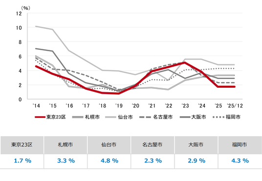 三幸エステート株式会社(本社:東京都中央区、取締役社長:福島正二郎)は、2025年12月度の東京都心5区(千代田区、中央区、港区、新宿区、渋谷区)および全国6大都市(東京、札幌、仙台、名古屋、大阪、福岡)の大規模ビル※1のマーケットデータをまとめた「オフィスマーケット2026年1月号」を公表します。
