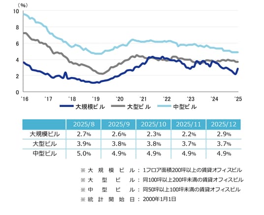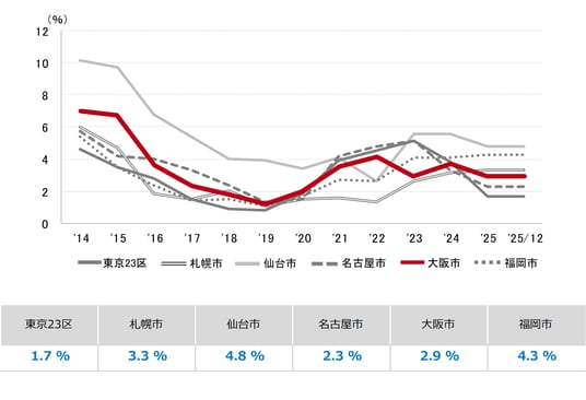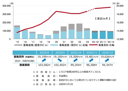 三幸エステート株式会社(本社:東京都中央区、取締役社長:福島正二郎)は、2025年12月度の大阪市オフィス賃貸状況(空室率&現空面積:大規模、募集賃料&募集面積:大規模、規模別空室率、主要3区※1空室率:大規模)および全国6大都市(東京・札幌・仙台・名古屋・大阪・福岡)の大規模ビルのマーケットデータをまとめた「オフィスマーケット2026年1月号大阪」を公表します。