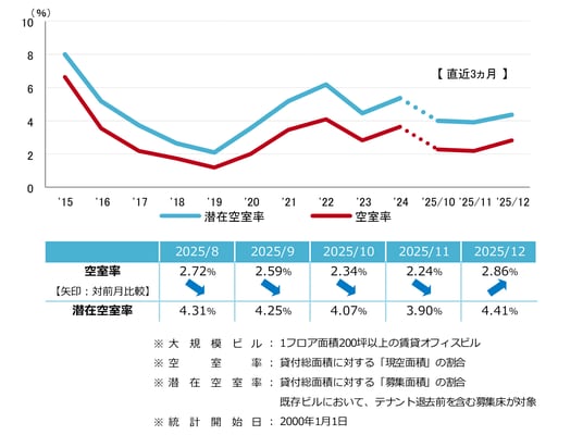 空室率は前月比プラス0.62ポイントの2.86%となり、6ヵ月ぶりで上昇した。空室を抱えて竣工した新築ビルが主な上昇要因だが、契約手続き中の区画もあり、今後は空室消化が進むとみられる。エリア別では「中央区」が前月比プラス1.8ポイントと大幅に上昇した。潜在空室率は前月比プラス0.51ポイントの4.41%となった。