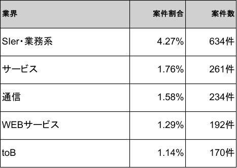 2026年1月時点のセキュリティエンジニア向けフリーランス案件・求人は、SIer・業務系が4.27%(634件)で1位、サービスが1.76%(261件)で2位、通信が1.58%(234件)で3位となっています。以下、Webサービスが1.29%(192件)で4位、toBが1.14%(170件)で5位と続き、上位5業界で全体の約10.0%を占めています。