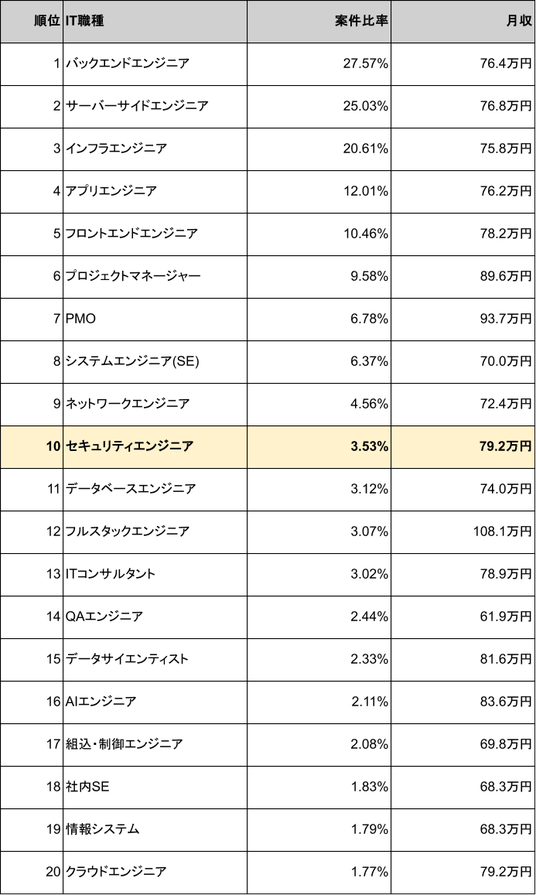 セキュリティエンジニアの案件は市場全体の3.53%を占め、IT職種別の案件数ランキングでは10位に位置しています。平均月額単価は79.2万円と比較的高い水準です。