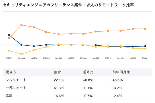 2026年1月時点のセキュリティエンジニア向けフリーランス案件・求人におけるリモートワーク比率は、フルリモートが22.1%、一部リモートが61.3%、常駐が16.6%となっています。フルリモートと一部リモートを合わせると83.4%に達し、在宅勤務を基本としながら必要に応じて出社する働き方が主流といえるでしょう。