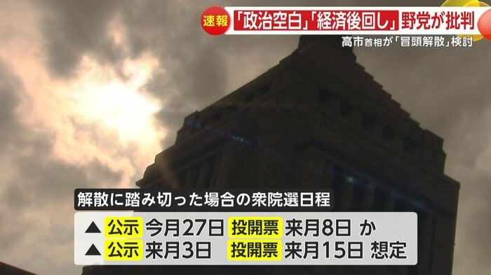 解散に踏み切った場合、衆院選の日程は、1月27日公示、2月8日の投開票か、2月3日公示、15日投開票が想定されている。