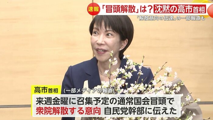 高市首相が、23日に召集予定の通常国会冒頭で衆院を解散する意向を固め、自民党幹部に伝えていたことを一部メディアが報じた。
