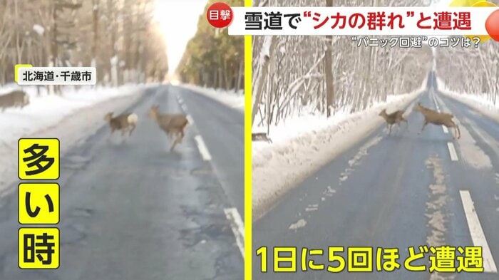 北海道・千歳市へ向かう雪道で、シカの群れが相次いで道路を横断する様子が捉えられた。多い時は1日に5回ほど遭遇するという。