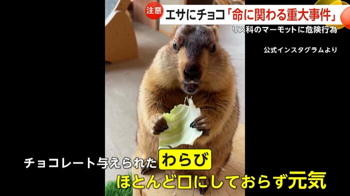 チョコレートを与えられたマーモットの「わらびちゃん」は、幸いチョコレートをほとんど口にしておらず、現在も元気に過ごしている。