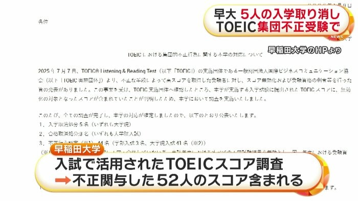 英語検定試験「TOEIC」の集団不正受験を巡り、早稲田大学は大学院生5人の入学を取り消したと発表した。