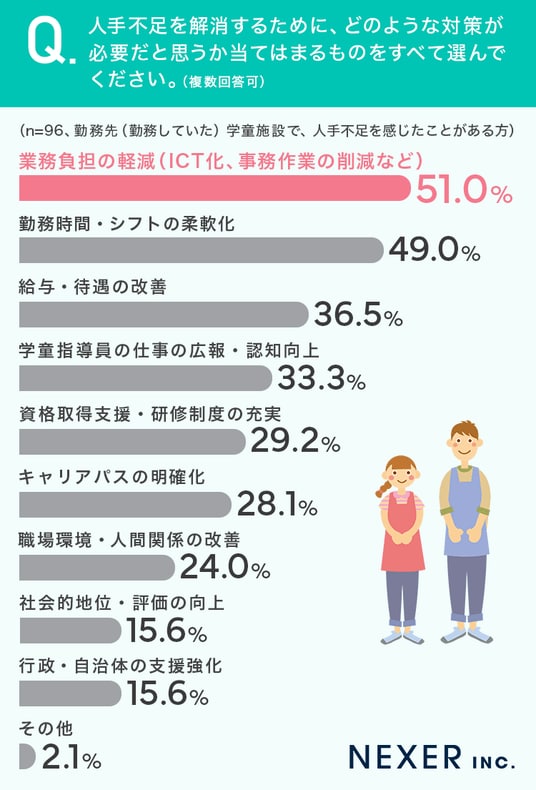 最も多かったのは「業務負担の軽減(ICT化、事務作業の削減など)」で51.0%でした。「勤務時間・シフトの柔軟化」が49.0%、「給与・待遇の改善」が36.5%、「学童指導員の仕事の広報・認知向上」が33.3%と続いています。