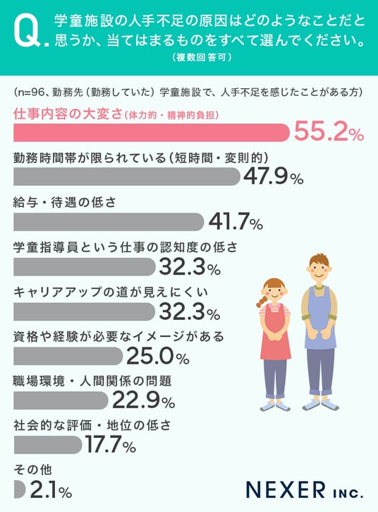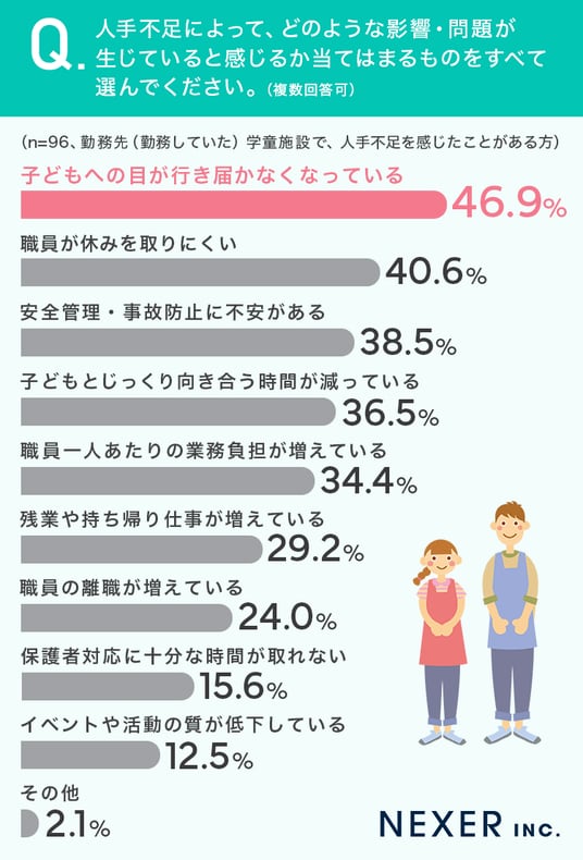 今回の調査では、学童施設で働く方の81.4%が人手不足を感じており、その影響として「子どもへの目が行き届かない」「職員が休みを取りにくい」といった問題が生じていることがわかりました。