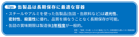 非常時の食・飲料で最も重視する点を尋ねたところ、「保存期限」が最も重視されていることがわかりました。缶製品はスチールやアルミの特長である高い密封性と遮光性によって長期保存が可能であり、非常用缶詰など非常時の備蓄品として多く採用されています。