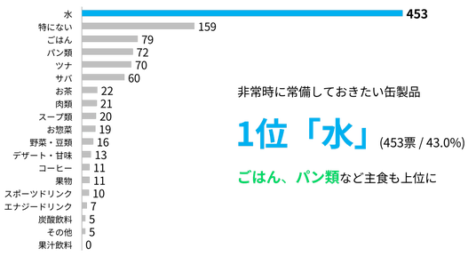 非常時に最も常備したい缶製品を聞いたところ、「水」と答えた人が全体の約半数の453票で1位となりました。その他「ご飯」や「パン類」など主食も上位に挙げられており、災害時の水不足や食料不足を考慮した缶詰製品が選ばれているようです。
