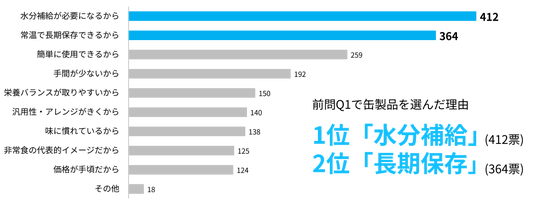 前問1.で缶詰製品を選んだ理由を聞いたところ、「水分補給が必要になるから(412票)」が最も多く、災害時の水不足を意識していることがわかりました。次いで「常温で長期保存できるから(364票)」が2番目に多い理由として挙げられており、防災グッズの保管や準備を手軽にできるよう長期保存が可能な缶製品が選ばれているようです。