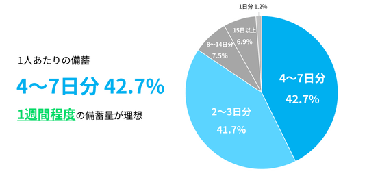 常備する備蓄品の目安として1人あたり何日分を備えたいか尋ねたところ、「4~7日分」と答えた人が42.7%で最も多く、1週間分程度の備蓄が理想とされています。災害時の復旧期間を見据えた計画的な備蓄が重視されていることがわかります。