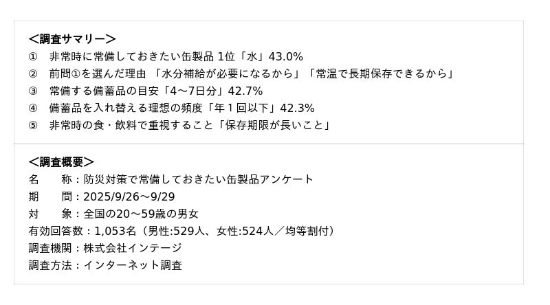 総合容器メーカー、大和製罐株式会社(本社:東京都千代田区丸の内、代表取締役社長:山口裕久)は、20~59歳の1,053人を対象に「防災対策で常備しておきたい缶製品」にまつわるアンケートを実施しました。本リリースでアンケートの結果を発表します。