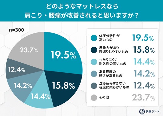 - 改善期待の条件1位は「体圧分散性が高いもの」(19.5%)だが回答は分散傾向