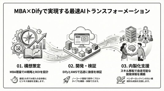 MBAスキル保有者によるIT戦略策定、Difyを活用したノーコードAI開発、AWS FTR認定取得済みの専門チームによるセキュアな基盤構築まで、AX推進の全フェーズを伴走支援いたします。