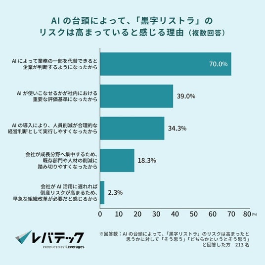 リスクが高まったと感じる理由としては、「『AIによって業務の一部を代替できる』と企業が判断するようになったから(70.0%)」が最も多くあげられました。