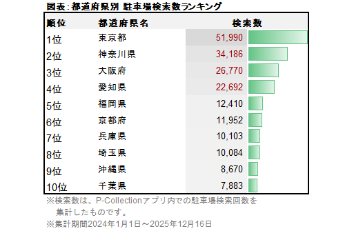 上位には、首都圏・関西圏・中京圏といった大都市圏を抱える都道府県が多くランクインしており、商業施設やオフィス、観光地などが集積するエリアで、目的地周辺の駐車場を検索する行動が日常的に行われている様子がうかがえます。
