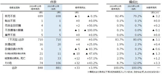 「放漫経営」(前年同月16件→20件、25.0%増)は、3カ月ぶりに前年を上回った。「経営者の病気、死亡」(同21件→33件、57.1%増)は前年から大幅に増加し、12月としては2000年以降で最多となった。