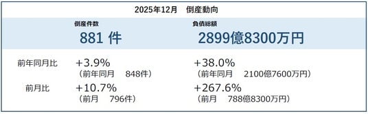 ■倒産件数は881件(前年同月848件、3.9%増)となり、2カ月ぶりに前年を上回った。12月としては、4年連続で前年を上回った
