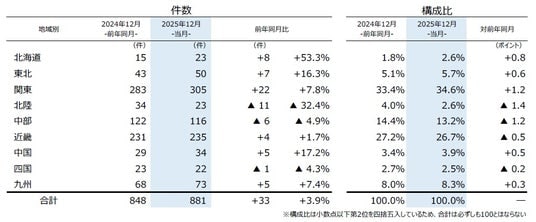 地域別にみると、9地域中6地域で前年を上回った。最も件数が多かったのは、『関東』(前年同月283件→305件、7.8%増)で、7カ月連続で前年を上回った。特に「栃木」(同10件→19件)や「埼玉」(同23件→38件)の増加が件数を押し上げた。『近畿』(同231件→235件、1.7%増)は、12月としては4年連続で増加した。