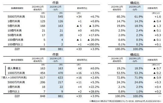 業種別にみると、7業種中4業種で前年を上回った。『サービス業』(前年同月215件→232件、7.9%増)が最も多く、12月としては2000年以降で最多となった。『建設業』(同161件→178件、10.6%増)、『小売業』(同186件→175件、5.9%減)が続いた。『卸売業』(同86件→105件、22.1%増)が最も増加し、5カ月ぶりに100件超となった。『不動産業』(同28件→23件、17.9%減)は、7カ月ぶりに前年を下回った。