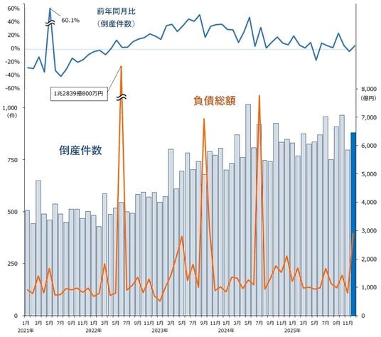 株式会社帝国データバンクは、2025年12月の企業倒産件数(負債1000万円以上の法的整理が対象)について集計し、分析を行った。