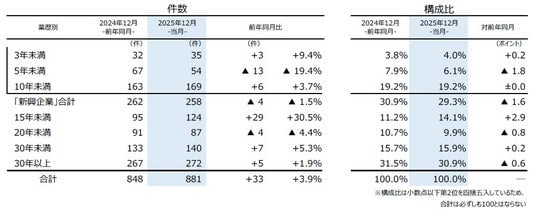 業歴10年未満の『新興企業』〈「3年未満」(前年同月32件→35件、9.4%増)、「5年未満」(同67件→54件、19.4%減)、「10年未満」(同163件→169件、3.7%増)〉は258件(前年同月262件、1.5%減)と全体の29.3%を占めた。内訳を業種別にみると、「サービス業」(同85件→77件、9.4%減)が最も多く、「小売業」(同68件→61件、10.3%減)、「建設業」(同52件→60件、15.4%増)が続いた。