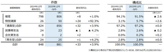『清算型』では、「破産」が806件(前年同月798件、1.0%増)で最も多く、12月としては4年連続で増加した。「特別清算」は50件(同26件、92.3%増)と大幅に増加し、2000年以降で過去2番目に多かった。
