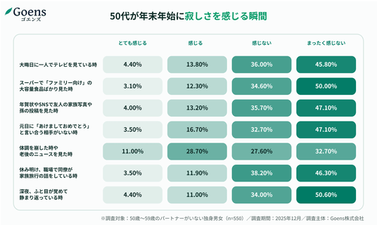 孤独を感じる瞬間ランキングでは、「あけましておめでとうと言い合う相手がいない時」「大晦日に一人でテレビを見ている時」などを抑え、「体調不良や老後のニュースを見た時」がトップに。情緒的な寂しさよりも、何かあった時に誰もいないという「孤立」への不安が浮き彫りに。