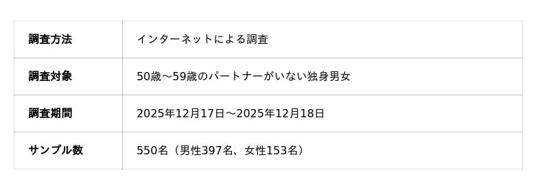 50歳以上限定のマッチングアプリ「Goens(ゴエンズ)」(運営:Goens株式会社/本社:愛知県名古屋市/CEO : 廣澤 和也)は、50代特有の孤独や恋愛観の実態を明らかにするため、パートナーがいない全国の50代独身男女を対象に意識調査を実施しました。