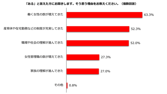 ・自社において、中間管理職の女性が産休後も同じポジションでスムーズに働けて、子どもの体調不良等による急な休みも取れているので、働きやすくなっていると感じる(20代:フリー/自営業)