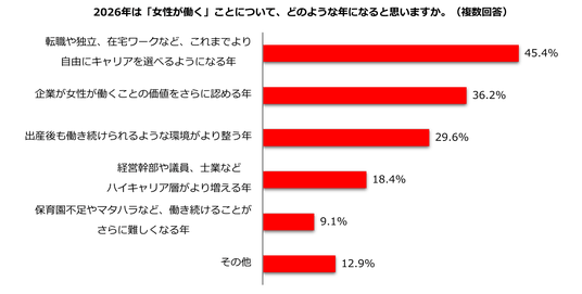 2026年がどのような年になるかについても「これまでより自由にキャリアを選べるようになる年」とする回答が最も多いなど、2025年に対する評価と同様の傾向が見られます。さらに「2026年は、2025年より「女性が働きやすくなる」と思いますか」との質問に対しては、実に62.7%が「思う」と答えました。前年より女性は働きやすくなると思うと回答した人の比率は、直近3年で上昇傾向にあります。フリーコメントでは、他調査(※)でも確認されたように、女性首相が誕生したことをポジティブに受け止める声がいくつも見られました。今年は午年。女性がより働きやすくなり、女性活躍から女性飛躍の年になっていく期待感の高まりを感じます。