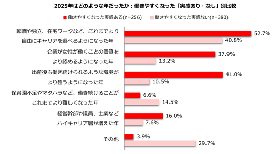 高市首相が誕生した2025年。主婦層を中心とする就労志向の女性に前年より働きやすくなった実感があるか尋ねたところ、「ある」と回答した人は40.3%で「ない」が59.7%と上回りました。しかしながら、過去3年を振り返ると毎年「ある」が上昇してきています。働きやすくなったと実感する理由としては「働く女性の数が増えてきた」が63.3%で最多。また2025年はどのような年だったかという質問には「転職や独立、在宅ワークなど、これまでより自由にキャリアを選べるようになった年」と答えた人が45.6%で最多でした。直近3年の推移を確認してみると「出産後も働き続けられるような環境がより整うようになった年」「企業が女性が働くことの価値をより認めるようになった年」が3年連続上昇。「経営幹部や議員、士業などハイキャリア層が増えた年」は2025年になって大きく上昇しています。2025年に働きやすくなった実感の有無別での比較では、これらの項目はすべて実感が「ある」と答えた人の比率が大きく上回っています。一方で、「保育園不足やマタハラなど、働き続けることがこれまでより難しくなった年」とネガティブな回答を選んだ比率は、実感が「ない」と答えた人の方が上回っており、働きやすさへの受け止め方が二極化している様子が伺えます。