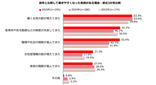 2.働きやすくなった理由「働く女性の数が増えてきた」63.3%/3か年比較