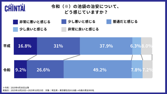 令和の池袋の治安については、「非常に悪い」「少し悪い」が合計35.8%にとどまり、“治安が悪い”と感じる人は平成よりも減少しました。一方で「普通」が49.2%、「少し良い・非常に良い」が合計15.0%となり、令和の池袋は“悪い街”というよりも「普通~良い」と評価する人が約6割を占める結果となっています。